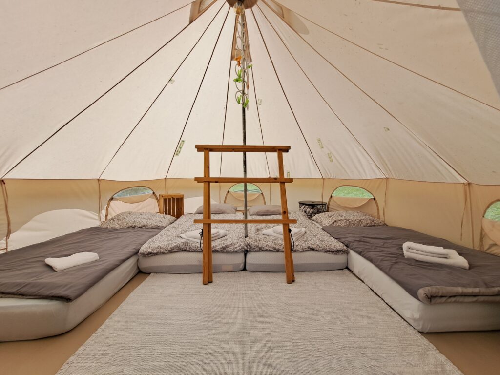 Ponujamo namestitev v lesenem in platnenem šotoru, ki se nahajata na družinski kmetiji.